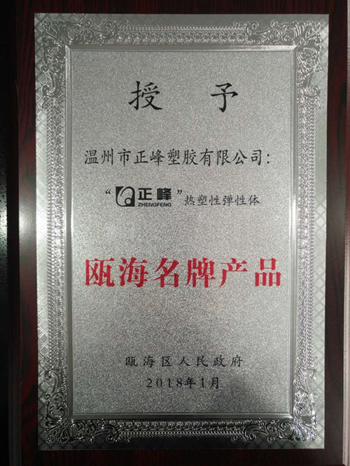 继 2016年被评为“国家高新技术企业”后,正峰塑胶再次传来喜讯,我公司生产的热塑性弹性体被瓯海区人民政府授予“瓯海名牌产品”称号,使我公司品牌建设之路往前迈出了跨越性的一步!